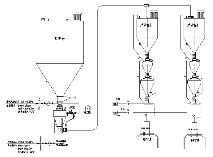 4.輸送系統(tǒng)是以空壓機(jī)作為動(dòng)力源,采用高密度的低壓栓流式輸送,將物料從發(fā)送器以灰栓形式由管道輸送至爐前倉(cāng)。輸送系統(tǒng)由發(fā)送器、進(jìn)出料閥、補(bǔ)氣閥、管路等組成。
